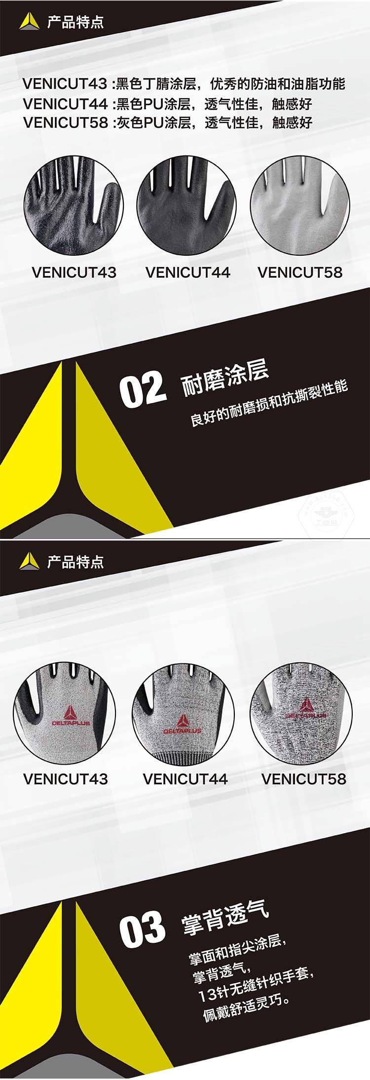 商品名称:代尔塔 3副装防割劳保工作手套 VENICUT43(3级耐磨4级防割)