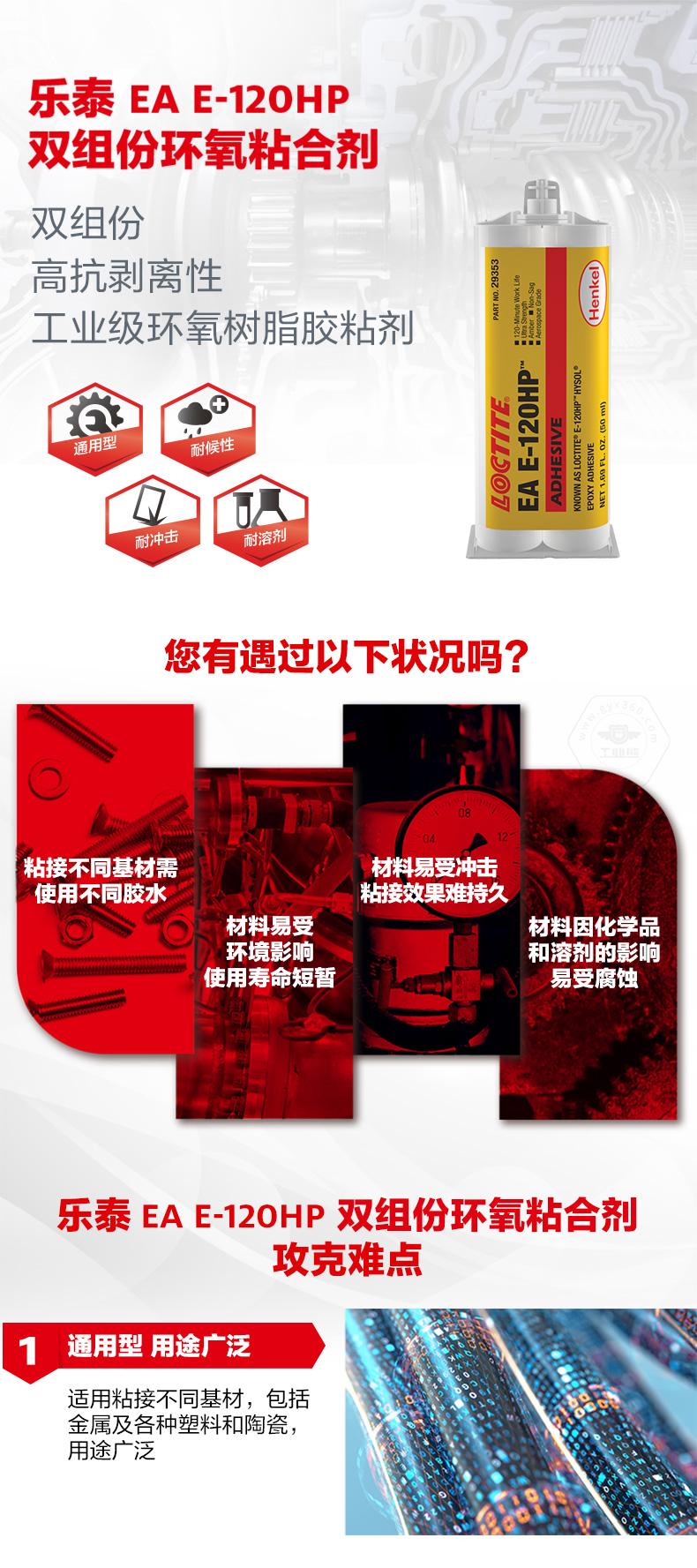 乐泰EA E-120HP双组份环氧粘合剂是一款双组份、通用型、具有高抗剥离性的工业级环氧树脂胶粘剂。乐泰EA E-120HP双组份环氧粘合剂具备耐候性、耐冲击和耐溶剂性能,可用于铝、钢和其他金属,以及各种塑料和陶瓷的粘接。乐泰EA E-120HP双组份环氧粘合剂适合需要高冲击力和高剥离强度的低应力、一般工业应用。